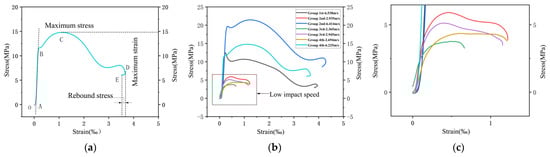 The stress–strain curves of multi-layer combined coal and rock specimens under high-velocity impact could also be divided into five stages, as shown in Figure 4a,b: