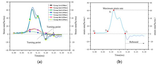 The axial strain curve of multi-layer combined coal and rock specimens without confining pressure under high-velocity impact are shown in Figure 5; it could also be divided into positive and negative stages. To be specific, firstly, the positive stage included three processes: (1) the initial and linear elastic stage—O1A1 (0–0.08 ms), the strain rate was relatively stable; (2) plastic stage—A1B1 (0.08–0.115 ms), the strain rate increased sharply to the peak point; (3) unloading stage—B1C1 (0.115–0.18 ms), the strain rate began to decrease. Secondly, in terms of the negative stage, the strain rate changed from positive to negative after the turning point C1 (0.18 ms), showing a significant rebound phenomenon. The time–history curve of strain rate under low-velocity impact could also be divided into positive stages and negative stages.
