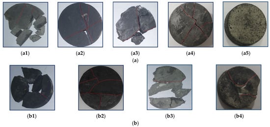 The dynamic failure modes of each layer of combined coal–rock specimens are shown in Figure 6. Under low-speed impact loading (2.945 m/s), the white sandstone was not damaged, and the coal and siltstone were damaged first in the 3rd group of combined coal and rock mass (SI–S–C–L–W), as shown in Figure 6a. The initial positions of the damage of coal and rock mass in each layer were the circle center and its vicinity. The crack extended radially and penetrated the whole coal and rock sample, forming obvious tensile failure. Under high-speed impact loading (6.414 m/s), the coal sample was damaged first in the 2nd group of combined coal and rock mass (L–C–S–SI–W), followed by siltstone and limestone, and finally white sandstone and shale, as shown in Figure 6b. The initial positions of the damage were also the circle center and its vicinity, and combined with failure modes, it was observed that there should be circumferential cracks, in addition to radial cracks.
