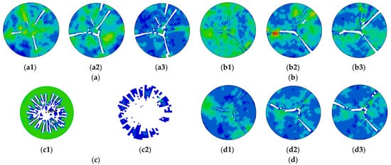 Dynamic damage and failure evolution of the 3rd group under low-speed impact loading (2.945 m/s). (a) Siltstone. (a1) 0.14 ms. (a2) 0.149 ms. (a3) 0.375 ms. (b) Shale. (b1) 0.108 ms. (b2) 0.14 ms. (b3) 0.273 ms. (c) Coal. (c1) 0.092 ms. (c2) 0.1 ms. (d) Siltstone. (d1) 0.136 ms. (d2) 0.172 ms. (d3) 0.236 ms.