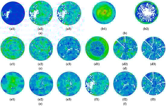 Dynamic damage and failure evolution of the 2nd group under high-speed impact loading (6.414 m/s). (a) Limestone. (a1) 0.08 ms. (a2) 0.103 ms. (a3) 0.14 ms. (b) Coal. (b1) 0.071 ms. (b2) 0.075 ms. (c) Shale. (c1) 0.083 ms. (c2) 0.131 ms. (c3) 0.356 ms (d) Siltstone. (d1) 0.08 ms. (d2) 0.091 ms. (d3) 0.17 ms. (e) White sandstone. (e1) 0.095 ms. (e2) 0.111 ms. (e3) 0.175 ms. (f) radial and circumferential cracks. (f1) circumferential cracks. (f2) radial cracks. (f3) radial and circumferential cracks.
