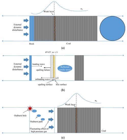 The coal and rock mass involved in coal and gas outbursts has different mechanical properties and discontinuous spatial distribution, such that this area is composed of multi-layer combined coal and rock mass [1]. Mining and excavation disturbances are the main external dynamic sources to induce outburst [2,3]; the progressive damage and instability of coal and rock mass in outburst preparation and excitation are the joint actions of external disturbance and in situ stress to multi-layer combined coal and rock mass. Under external disturbance, coal and rock mass shows strong dynamic response characteristics, and the dynamic mechanical properties and failure modes are significantly different from those under static load [4,5,6]. When the local disturbance stress is higher than the tensile strength, damage and fracture occur in the corresponding areas, forming macro cracks, resulting in the instability and failure of coal and rock mass [7]. In addition, external dynamic disturbance propagates in multi-layer combined coal and rock mass in the form of stress waves; therefore, reflection, transmission and diffraction occur at the interfaces of coal–rock, rock–rock and coal–coal, resulting in reflected tension, convergence and superposition of stress and strain, and sudden changes of reflected and transmitted stress, which could lead to strong vibration, dynamic damage and instability and failure of coal and rock mass, which are the key factors leading to the outburst [8,9]. Spallation is a typical phenomenon in coal and gas outburst, which is closely related to the whole process of outburst, including preparation, initiation, development and termination. Scholars usually regarded the coal and rock mass in front of cross-cut coal uncovering and tunneling face as a combined multi-layer coal and rock mass, and they established the seepage instability and unloading wave action models [10]; they believed that the interaction of unloading waves forms high tensile stress at the interfaces with large differences in mechanical properties, resulting in sudden instability and failure of coal and rock mass [11,12], which may be closely related to the spallation phenomenon. At present, the layered coal and rock mass is usually regarded as a transversely isotropic continuum, and the damage mechanism of single-layer coal and rock mass were studied based on Euler formula, compression bar stability theory, the Mohr Coulomb yield criterion and the flexural failure mechanical model [13,14,15,16,17,18]. However, the research on the dynamic response characteristics, and the damage and failure modes of multi-layer combined coal and rock mass is still in the initial exploration stage [19,20,21,22].