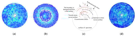 In the propagation and interaction of loading and unloading waves, the “weak layer” was damaged first by tensile stress and formed a free surface, and the subsequent loading waves were reflected on the free surface to form unloading waves and tensile stress, resulting in damage and spalling along the axial direction (Figure 10b). Assuming that the loading wave was a rectangular wave, the spallation thickness should be half the wavelength. According to the actual situation, the longitudinal wave speed of the coal body was set to 1600 m/s, and the rectangular wave action time was about 0.036 ms (Figure 6); then the data calculated that the wavelength λ = 5.76 cm, and the thickness of the spalling fracture was 2.88 cm, which was consistent with field tests and experimental results [26]. In this process, under low-speed impact loading, the surface cracks mainly developed in the radial direction, as showed in Figure 11a; under high-speed impact loading, the circumferential boundary of the “weak layer” was prone to damage to form a free surface. Due to the Poisson effect, a significant lateral inertial effect was produced, i.e., lateral expansion and contraction, so as to generate compressive stress waves along the radial direction, and then these compressive stress waves were reflected on the free surface to form tensile stress waves, which gradually accumulated to the central point and became larger and larger, accordingly. During this process, if the tensile stress exceeded the tensile strength σs, circumferential cracks were formed (Figure 11b), the entire process of which is shown in Figure 11c. Eventually, circumferential and radial cracks (Figure 11d) were formed on the surface to generate spallation with a certain arc (Figure 9).