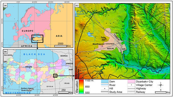 - Karadoğan, S. Yerleşmeye Etkileri Açısından Diyarbakır Kenti ve Yakın Çevresinin Doğal Peyzaj Unsurları. In Diyarbakır Kalesi ve Hevsel Bahçeleri kültürel peyzajı; Soylukaya, N., Ed.; Diyarbakır Büyükşehir Belediyesi Yayınları: Diyarbakır, Turkey, 2015; pp. 1–16. [Google Scholar]