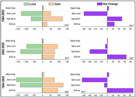 | LULC Classes | 1984–2002 | 2002–2020 | 1984–2020 | 1984–2002 | 2002–2020 | 1984–2020 |