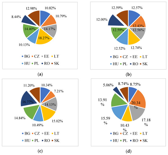 From Figure 1f, one can see that, for the ‘patent applications to the European Patent Office’ indicator, the country with the highest level is EE (35.29%), followed by CZ (18.56%) and then PL (11.9%). The value registered for RO (2.01%) ranks it last due to the low number of patent protection applications filed with the European Patent Office.