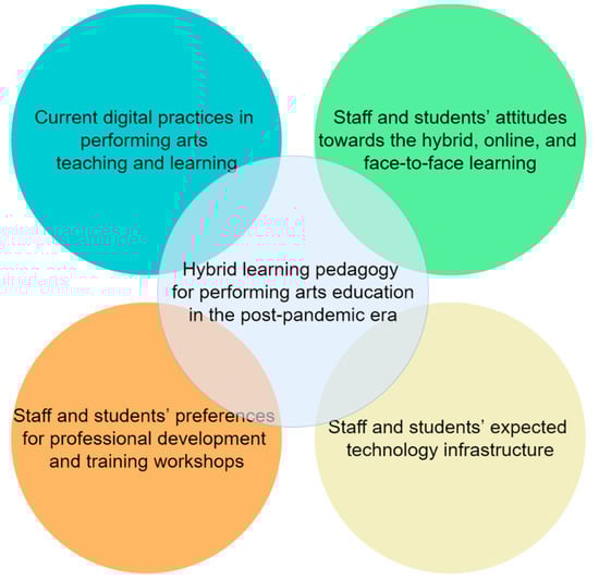 The survey was conducted among students and academic staff between September and October 2021, to validate the hybrid learning pedagogy and investigate the following four research questions (see Figure 1): (1) What are the current digital practices in performing arts teaching and learning?; (2) What are academic staff and students’ attitudes towards hybrid, online, and face-to-face learning based on their past learning experience?; (3) What are their preferences for professional development and training workshops?; and (4) How would the expected technology infrastructure improve teaching and learning quality. Furthermore, this study presents evidence on whether or not the virtual environment is beneficial for teachers’ teaching and students’ learning. It also reveals their readiness, preferences, and recommendations for further improvements.
