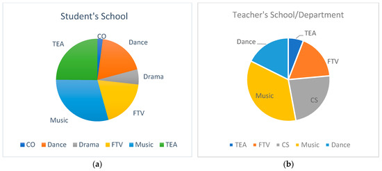 Quantitative and qualitative research methods employing relevant data analysis are used in this research. It is noteworthy that the survey includes qualitative questions (fill in the blank) inviting participants to elaborate on various experiences they have encountered during online and hybrid teaching and learning. In total, 408 students (251 females and 159 males between the ages of 18 and 41) and 17 teachers (6 females and 11 males between the ages of 27 and 50+) completed the survey. The student participants represented six schools (Figure 3a), with 367 of them from undergraduate (UG) programmes, 38 from postgraduate (PG) programmes, and 3 from post-secondary (PS) programmes. The teacher participants came from Complementary Studies (4), Dance (3), FTV (3), Music (6), and TEA (1) (Figure 3b). The survey findings are presented in the next section.