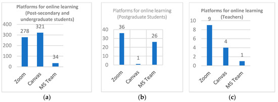 Canvas is the learning management system used at the Academy by all teachers and students. In terms of online-platform use among undergraduate and post-secondary students, 79% (321) of the student participants have used asynchronous platforms, i.e., Canvas. For synchronous platforms, 68% (278) have used Zoom, and 8% (34) have used Microsoft Teams (Figure 4a). For postgraduate students, 95% (36) have used Zoom, and 68% (26) have used Microsoft Teams, while only 1% (1) have used Canvas (Figure 4b). For teacher participants, 53% (9) have used Zoom, 6% (1) have used MS Teams, and 24% (4) have used Canvas (Figure 4c). The low Canvas usage among postgraduate students could be attributed to the fact that these students are new to the Academy and that the survey was conducted towards the beginning of the semester. These students did not use other types of asynchronous platforms or other learning management systems. This demands more learning assistance for the postgraduate students from the Academy to overcome the learning barriers on using asynchronous platforms. This finding further indicates that the introduction of such a learning management system is needed as soon as possible for new students, particularly at the postgraduate level when entering the Academy.