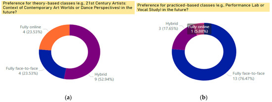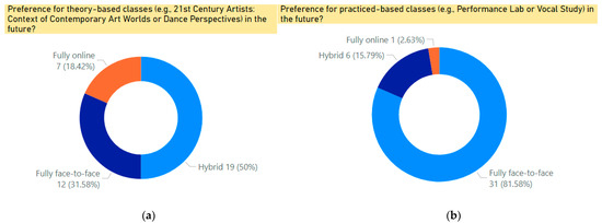 Among faculty members, the findings also show a stronger preference for the hybrid or online mode of learning for theory-based courses (77%) (Figure 9a) but a stronger preference for face-to-face learning for practice-based courses (76%) (Figure 9b). It is evident that teachers also feel the need for changing the way performing arts courses are delivered. While theory-based courses could be taught in an online or hybrid mode, a lot of effort, such as developing relevant skills, are needed. Teachers express their willingness to participate in the associated professional development activities, which is further discussed in the latter part of this study.