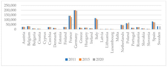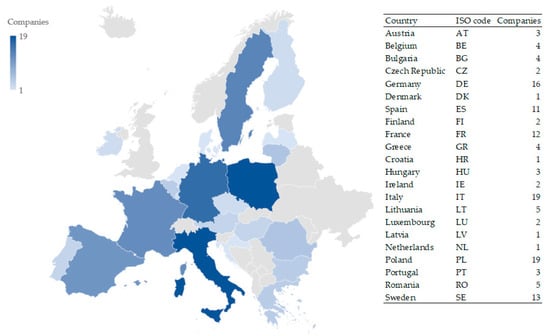 As previously mentioned, the current study aims to explore the causal relationship between intangibles and performance and the moderating effect of CEO duality and CEO gender. The analysis is based on a 10-year timeframe (2011–2020). Through a quantitative approach, the paper scrutinises a panel dataset of 133 EU-listed companies from the electricity and gas industry. Figure 4 gives a bird’s-eye view of the geographical distribution of the analysed companies. Both Italy and Poland (a developed country since 2018 according to FTSE Country Classification, [69]) host the headquarters of 19 electricity and gas companies, while 16 energy companies are located in Germany. The majority of the sampled enterprises are geographically concentrated in developed countries (Italy, Poland, Germany, Sweden, France, and Spain). Emerging countries from Eastern Europe (Romania, Bulgaria, Latvia, and the Czech Republic) are less attractive to investors in the energy sector as the data show.