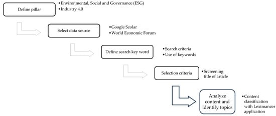 In Figure 1, the first stage involves screening and gathering applicable documents and related topics from the World Economic Forum (WEF) Strategic Intelligence [3] and academic databases. The keyword in Table 1 was used according to the search query. Only articles in recent years that have been published from 2017 to 2021 were considered. A total of 583 were processed. This move included undertaking a wide literature review quest for abstracts, related topics, and key issues relating to Industry 4.0 and ESG.