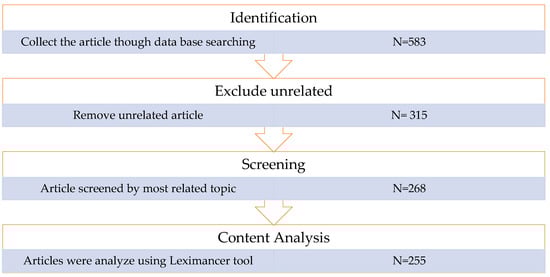 In the second point, the anthology items, as well as the theoretical and practical white papers, were included to incorporate (see Figure 2). However, in terms of quality, publications that violate fundamental scientific principles, such as reference handling, were removed from the analysis. As a result, our study is based on a content analysis of 255 publications to find the greatest correlation words as the concepts, and the top content categorization as the themes. The Leximancer software [67,69,75] gathered the most fragmented words and correlations based on Industry 4.0 and ESG. Finally, the papers were reviewed to find a positive impact on the key principles that were established on the research pillars. As a subject, the study dataset was collected from the highlights of Themes and Concepts (see Figure 3).