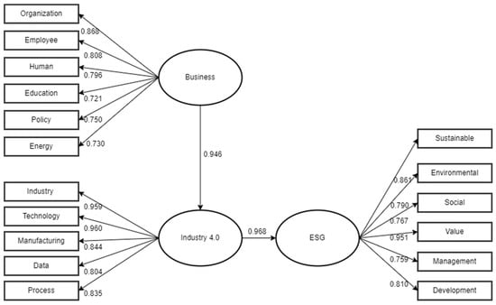 The result of the second-order confirmatory factor analysis on Industry 4.0 and ESG.