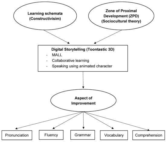 Deep discussions allow students to agree, disagree, and mutually criticise reasoning, allowing them to take advantage of the social aspect of learning with the ultimate objective of allowing members of the small group to ‘scaffold’ one another []. The constructivist classroom, which capitalises on the nature of social learning and employs scaffolding, reciprocal teaching, and classroom interaction, can be a successful learning environment []. Since a digital story is a strong work of art that might arise from a “shared experience”, sociocultural theory and digital storytelling have various similarities []. As stated by [], learners may cooperate, engage, share ideas, assist, and encourage one another, as both digital and traditional storytelling may be a significant and successful social approach to improve learners’ speaking abilities.