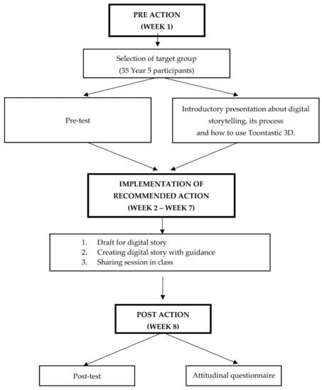 In this section, the researcher explains the implementation of the prescribed action. The participants that were chosen had limited levels of fluency, accuracy, and pronunciation in their School-Based Assessment (SBA). Following that, each of the research participants was given a consent form to sign as a confirmation of their involvement in the study, as well as pseudonyms and numbers to ensure confidentiality. The whole implementation of the research was continuously carried out for eight weeks, while the implementation of digital storytelling was carried out via Google Meet, as the research participants were learning through online classes due to the pandemic. As the initial phase of the data collection procedures, during the first week, a pre-test was conducted before the lockdown in May during the first week. The pre-test was carried out to identify the level of pupils’ speaking skills based on Harris’s Oral Rating Scale (Appendix A).
