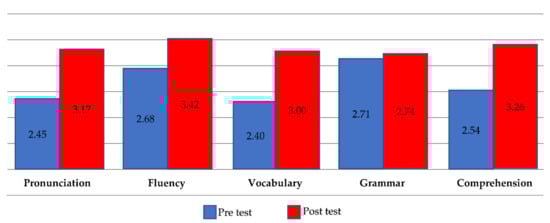 Comparison of pre- and post-test results on all speaking aspects (mean score).