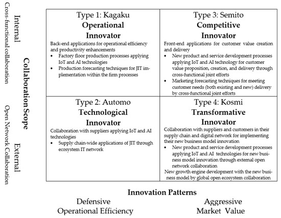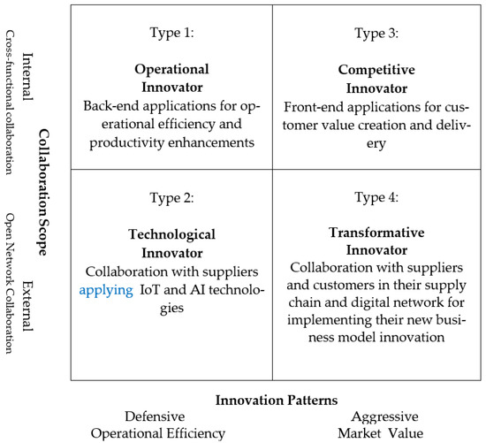 The operational innovator (Type 1) is characterized by back-end applications of operational efficiency and productivity enhancement through focusing on internal cross-functional collaboration and a defensive innovation approach. The technological innovator (Type 2) has a broad scope of collaboration through open network collaboration with suppliers while applying various available technologies, such as IoT, blockchain, and AI. The competitive innovators (Type 3) are noted for their front-end applications (R & D, marketing, and strategy) of customer value creation and delivery with their aggressive pursuit of customer market value. The transformative innovators (Type 4) are distinct in that their suppliers and customers are also involved in their open digital network for the business model innovation
