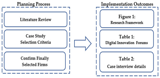 In this paper, we adopt the deductive, qualitative, and exploratory research of the case studies [52]. Figure 2 shows the case study process in terms of (1) the planning process and (2) the implementation outcomes. The planning process has three steps (i.e., a literature review, the case study selection criteria, and the final selection), whereas the implementation outcomes include a research framework, digital innovation forums, and case interview details. They are summarized in Figure 2, Table 1 and Table 2.