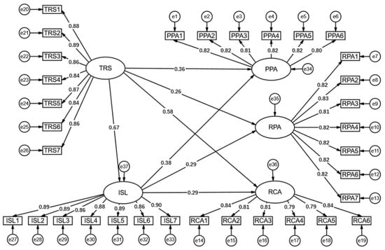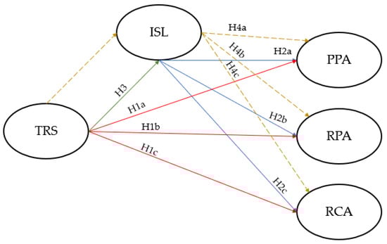 The core hypotheses were assumed and analyzed through SEM (see Table 7 and Figure 3). First, it was proposed in H1a that TRS was positively correlated with PPA. The findings confirmed a positive effect (β = 0.353) between TRS and PPA at a significant level of p < 0.001. Therefore, H1a was supported. Second, H1b hypothesized that TRS was positively correlated with RPA. The findings asserted a positive relationship (β = 0.254) between TRS and RPA at p < 0.001; consequently, H1b was supported. Third, it was hypothesized in H1c that TRS was positively correlated with RCA. The findings affirmed a positive relationship (β = 0.574) between TRS and RCA at p < 0.001. Thus, H1c was supported. Similarly, the direct effects of ISL on PPA, RPA and RCA were all significant; the path coefficients were 0.382, 0.300, and 0.296 respectively, as shown in Figure 3, demonstrating that H2a, H2b, and H2c were supported. In addition, the results also confirmed a positive effect (β = 0.676) between TRS and ISL at p < 0.001; therefore, H3 was supported.