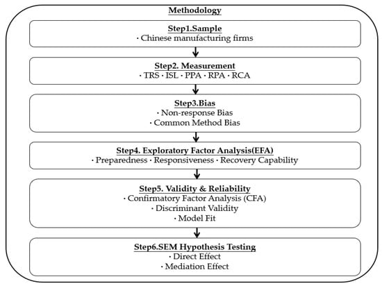 We proposed the following research design. First, this study used a questionnaire as a research tool to empirically investigate Chinese manufacturing companies. We explored the dimensions of manufacturer resilience to demonstrate the usability of the scale, which could be utilized by future scholars. Second, we performed the common method bias test, which could avoid the problem of bias in this study [18,52]. In addition, we examined the reliability and validity of the questionnaire, including confirmatory factor analysis, discriminant validity testing, and model fit testing, to demonstrate that the model and questionnaire in this paper could be analyzed for the structural equation model. This was followed by structural equation modeling hypothesis testing. This paper used the bootstrap method and adopted a 5000-times sampling technique, which allowed for the distribution of the sample closer to a normal distribution and statistically significant [109]. Figure 2 illustrates the main process of the statistical analysis methods.