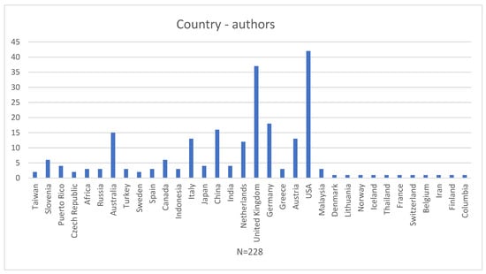 - Distribution of departments/Relations between authors in different countries: I explored the geographic area of departments that have explored the concept of SC and the collaborations between authors from different countries. This choice was made to see how the relationship between SC and energy transition was approached based on different cultural realities [].