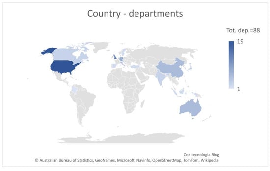 In total, I found 35 nodes and 48 ties. Some countries, such as Denmark, Russia and Colombia, have not collaborated with other countries in writing articles on SC and energy transition. Japan appears to be the state that has the most relations with the outside world within the European context (Spain, Italy, and Germany). It is very interesting to see how other countries, despite not being geographically close, have built a network with other countries, such as the UK and Africa or the USA and India. This makes us understand that there is a willingness to collaborate even if the authors’ working contexts are very different. A collaboration that considers different contexts could help to deepen these two concepts giving a more global vision of the relationship between SC and energy transition. The following image (Figure 4) shows the location of the departments to which the authors who have worked on this topic are affiliated (If several authors of the same article collaborated in the same department, the department was only entered once anyway).