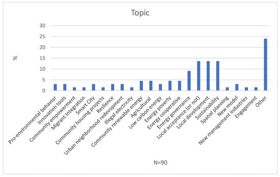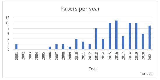As can be seen, there are states that have dealt with this issue more than others, in particular the United States (19 departments) and Great Britain (14 departments). The United States is an important pillar in the history of energy transition and, in particular, citizen participation in this process. In fact, some terms that identify precisely a change in the role of citizens in energy-related decision-making, such as “energy democracy”, originate in the United States []. In this context, it is also important to remember that the Aarhus Convention and UN policies in some countries, particularly in the UK and US, guide planning policies that ensure that public participation takes place with local communities in many projects such as low-carbon infrastructure []. These could be some of the reasons for these countries to contribute more to understanding the link and influence between SC and energy transition. The following graph (Figure 5) shows the papers published in the last 20 years on SC and energy transition (N = 90). The papers are distributed as follows.