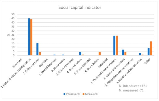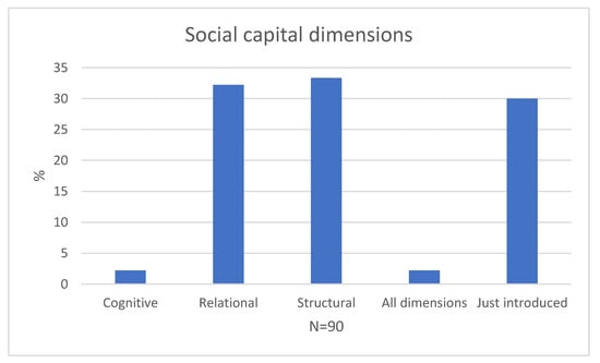 From Figure 8, the two dimensions of SC that are considered are relational and structural. This is linked to what was previously considered in the definition of SC. In fact, the structural dimension refers to the network within the community. In order to address the characteristics of SC and to provide a shared model, SC was usually divided into two dimensions, structural and relational, which in some cases were confused, such as in the work of Nyqvist et al. [], who classify some indicators of SC that belong to the relational dimension to the cognitive dimension. Nyqvist et al. [], in fact, consider structural SC as “networks, relationships, and institutions that connect people and groups” [], quantification of network ties and group participation, and cognitive SC, which refers to “values, attitudes, trust, confidence, and norms”, measured through more subjective characteristics. In particular, the structural dimension refers to what people do in their social life, while the cognitive dimension refers to how people feel about their social life []. Only three of the articles of the literature review within their research take into account all three dimensions. This is an aspect that is also highlighted in the paper of Broska [], which highlights the lack of the three dimensions of SC in all studies that link SC to pro-environmental behaviours. In some of the articles, the concept of SC was only introduced but not further explored, and therefore, it was not possible to identify one or more of the dimensions of SC.