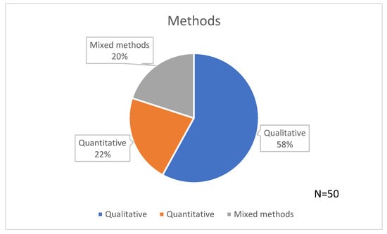 From Figure 9, the network indicator is the most often considered. Followed by trust and ties, these indicators are part of the structural and relational dimensions. An interesting aspect that could explain this gap between the introduction and use of these indicators is that very often, SC is not actually measured with specific questions but is only used as an element that can explain certain phenomena (see: []). The network in Balfour and Alter’s [] research was used to identify critical actors in the community; the results of this analysis were considered important in understanding the dynamics within the community. The same article by Broska [] considers, in the initial part of his article, the three dimensions of SC. The empirical part of his research does not consider explicit questions on some of these indicators but is the result of an interpretation of the results of the interviews. The cognitive dimension is considered an important indicator of SC by some authors [,], but no method is used to be able to qualitatively or quantitatively understand this indicator. Another element that could also explain this gap between the elements considered and those measured is that in some articles (ex: []), some indicators such as trust, considered important as an indicator in the next stage of analysis, are explained using networks. An interesting aspect of indicators is that there are usually positive and negative aspects to SC, but usually, in the various research, the former is considered while the latter remains unknown []. The following graphs (Figure 10 and Figure 11) represent the methods that were used to collect the data in the various studies (The total number of research considered in these graphs is 50, the remaining 40 articles have not been considered because they are not empirical research or secondary data were used (12 articles) that cannot be entered in either method.) From Graph 10, there are different types of methods used to collect data.