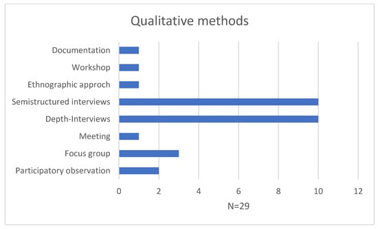 There are several methods that are used to collect data, the most used being semi-structured interviews and in-depth interviews. In some research [,], data are collected with qualitative methods such as in-depth interviews or documentation concerning the local reality, but in a later stage of analysis, quantitative methods are used in which the authors analyse the data. Anderson and Schirmer [] used a qualitative approach using semi-structured interviews, as did Atwell et al. [] and Bereményi et al. []. Haque et al. [] and Perez-Sindin [] used a qualitative method but included focus groups in addition to the semi-structured interview. In some cases, the participatory observation method was used [,].