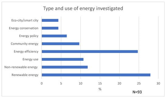 The following graph (Figure 12) (The total number of articles in this chart is 93 and not 90 as the number of articles selected because 3 of the articles refer to both renewable and non-renewable energy (i.e., nuclear and photovoltaic);) (Non-renewable energies to be included in these categories have been selected in accordance with US Department of Energy (Energy Sources | Department of Energy);) (The categories eco city and smart city have been included in the same category, because in this study I was interested in the social and environmental aspect that both have in common: they share the aspirations of reducing environmental loads and improving human welfare (www.ecocitystandards.org: access 17 May 2022);) considers the different types of energy or energy sustainability that are considered in SC research.