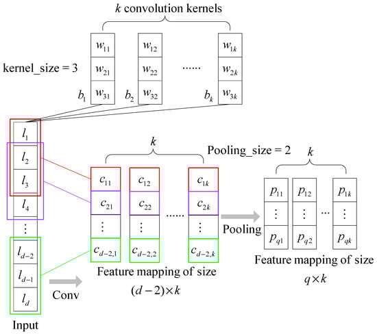 The sliding window operation in pooling is similar to the convolution operation, and the pooling size is set to 2 in the experimental section. Pooling operator is a process of dimensionality reduction by continuously sliding the window with height 2 and width 1. Maximum pooling selects the largest value from the fixed region of interest as the output, where the region is obtained by convolution in the sliding window. After convolution and pooling operators, the previous feature matrix is eventually be transformed into another matrix , where , .