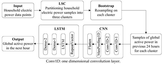 Samples generated by the global active power data are firstly passed on to the input feature vector module, and then all input samples are partitioned into three clusters through LSC. Subsequently, bootstrap aggregating is applied in each cluster to increase the number of samples. For each cluster, the global active power of household electricity in previous 24 h is used as the input of deep neural network. The feature extraction module in CNN mainly includes two one-dimensional convolution layers and a maximum pooling layer. Specifically, one-dimensional convolution can read the sequence input features and automatically learn the latent features. The first convolution layer establishes the feature map from the input sequence, and the second performs the same convolution operation on the feature map created by the first layer to enlarge its salient features. The maximum pooling layer simplifies the feature map obtained by convolution for the sake of dimensionality reduction. Finally, the reduced feature map is flattened into a long vector through leveling.
