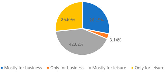Some of the main findings of the survey are summarized as follows. The first part of the survey, related to mobility profile, analyzed the most common motives for traveling by airplane such as “mostly for business”, “only for business (meetings, conferences, etc.), “mostly for leisure”, and “only for leisure (vacation, visiting family, etc.)”. According to the answers, “mostly for leisure” was selected as the most common purpose of travel for most of the respondents, resulting in 42.02%, Figure 1. On the other hand, the lowest number of respondents, 3.14% of them, selected “only for business”.