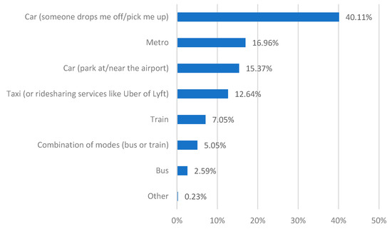 The second part of the survey was related to the travel preferences of passengers, where respondents selected transport options for arriving to/from the airport among “train”, “taxi (or ridesharing services like Uber of Lyft)”, “metro”, “combination of modes (bus or train)”, “car (someone drops me off/pick me up)”, “car (park at/near the airport)”, “bus” mode choice alternatives. As expected, most of the respondents (40.11%) selected “car (someone drops me off/pick me up)”, while “bus” was the chosen by the least number of respondents (2.59%), Figure 2.