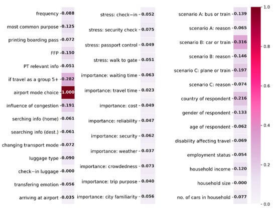 The structure of the survey was made from the total of 44 variables (22 nominal string variables with more than 2 answer choices, 13 numeric (Likert) variables, 7 binary variables, and 2 continuous/scale questions (complete questionnaire can be seen in [30])). However, we concentrated on the questions related to the mode choice and the factors that influence mode choice. Related to those selected variables, since most of them are nominal, we first performed Cramer’s V test to get an insight into the strength of the relationship between observed categorical variables. Figure 3 presents a heatmap with the results of Cramer’s V test which measure association between the airport access mode choice and all other variables from the survey. Based on the obtained results, variables with Cramer’s V test statistics value higher than 0.1 were further transformed into quantitative (dichotomous) categorical variables and Pearson’s correlation was applied to determine meaningful correlations.