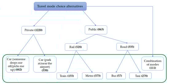 The multinomial analysis was applied to determine explanatory variables that affect the traveler’s choice. As shown in Figure 4, the categorical dependent variable (question related to mode choice) is formed by seven alternatives with a different number of answers, ranging from 57 for the mode “Bus”, and 882 for the choice “Car (someone drops me off/picks me up)”. The independent variable considers the importance of significant attributes “waiting time”, “travel time”, “travel costs”, and “reliability” in the question related to the factors that influence the mode choice, as well as socio-demographic information. In the case of the question as a dependent variable, we merged the alternatives in two choice sets: private and public transport. As shown in Figure 4, the considered sample of a total of 2083 cases was formed by 1220 respondents who preferred private modes of transport, and 863 that opted for public modes of transport.