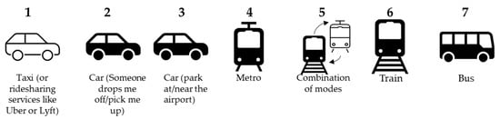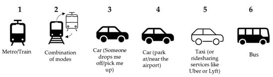 Therefore, the main questions that arise are: (i) If “train”, “taxi (or ridesharing services like Uber of Lyft)”, “metro”, “combination of modes (bus or train)”, “car (someone drops me off/pick me up)”, “car (park at/near the airport)”, and “bus” modes are available, which one is the most commonly chosen to travel to/from the airport? (ii) What are the factors that affect transport airport access mode choice? Furthermore, we analyzed the influence of the factor “reliability” and “waiting time”, as well as the impact of non-coordination in the multimodal travel chain.