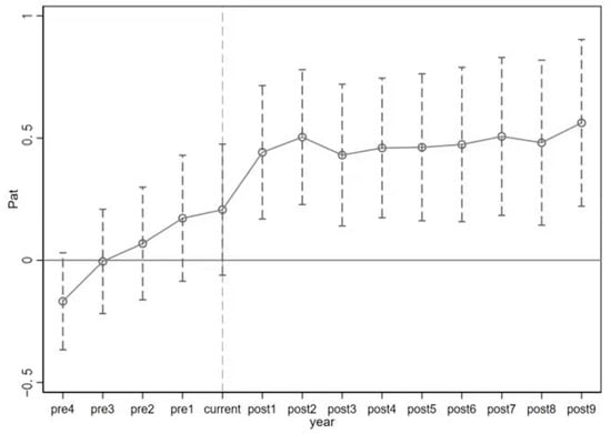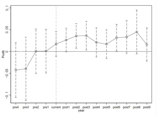 The effectiveness of the DID model depends on satisfying key identification assumptions. The parallel trends assumption requires a similar trend in technological innovation and financial performance between experimental and control groups prior to the 2012 guideline. In accordance with the popular parallel trend hypothesis testing method [39,40], this paper uses the event study method to further examine the changing trends of the treatment group and the control group. The following equations are constructed for dynamic effects analysis: