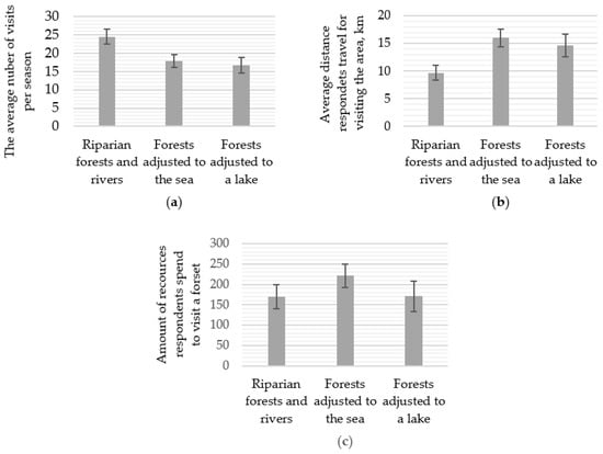 Furthermore, after analyzing the answers from respondents that visited forests that grow next to rivers, lakes, or the sea, information about times of the visits per season were compiled and significant differences regarding the times of the visits for each of these forest types were observed. People visited forests next to the sea for recreation or sport activities 17 times on average per season, but visited forests that grow next to lakes 18 times on average per season (Figure 1a). However, people who visited river riparian forests tended to do so more often, going up to 25 times on average per season. There were also significant differences in distance that people tended to travel in order to visit a certain type of forest. Based on the respondents’ answers, people tended to travel the furthest distance, an average of 16 km, to visit forests that grow next to the sea (Figure 1b), but the shortest distance, an average of 10 km, was travelled by respondents to visit river riparian forests.