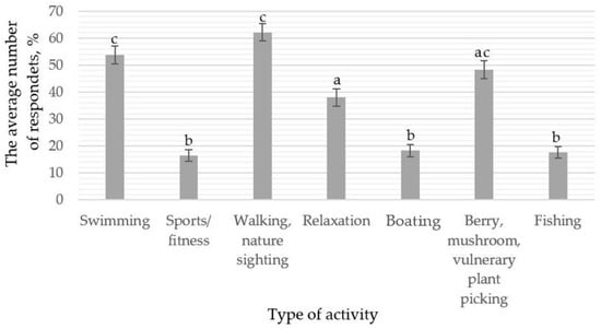 Conversely, no significant differences were present for the resources that people were willing to spend in order to visit different types of forests. Nevertheless, Figure 1c shows that the greatest amount of recourses were spent to visit forests that grow next to the sea (an average of 222); however, for the purpose of visiting forests growing next to the lakes and rivers, respondents spent an average of 171 and 169 resources, respectively. When looking at the preferred activities for which respondents visit riparian forests, significant differences could be seen. The majority of respondents commuted to riparian forests to have a walk (62%) or swim (54%), and 4% of respondents tended to pick berries and mushrooms in riparian forests (Figure 2). Less popular activities that respondents participate in in riparian forests and rivers were fishing and hunting (18%), boating (18%), and sports/fitness (17%).