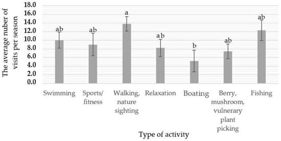 The average number of times per season respondents visited riparian forests to perform a certain type of recreational activity. Error bars represent standard error (SE); letters above the bars show if there are statistically significant differences (p < 0.05) in the average number of visits per season between the types of activities (the same letter/letter combination for the type of activity—no statistically significant differences; if letters/letter combinations differ between the types of activities—there are statistically significant differences).