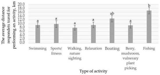 The average distance (km) that respondents travel in order to visit riparian forests and perform a certain type of recreational activity. Error bars represent standard error (SE); letters above the bars show if there are statistically significant differences (p < 0.05) in the average distance the respondents travel for recreation purposes between the types of activities (the same letter/letter combination for the type of activity—no statistically significant differences; if letters/letter combinations differ between the types of activities—there are statistically significant differences).