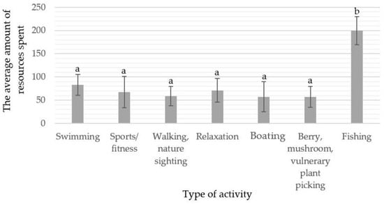The amount of resources (travelled distance × number of visits per season) that respondents spend in order to visit riparian forests and perform a certain type of recreational activity. Error bars represent standard error (SE); letters above the bars show if there are statistically significant differences (p < 0.05) in the average amount of recourses spent between the types of activities (the same letter/letter combination for the type of activity—no statistically significant differences; if letters/letter combinations differ between the types of activities—there are statistically significant differences).
