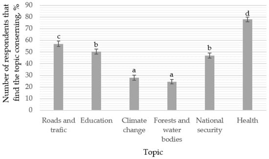 Respondents’ attitude (concerned/not concerned) towards different topics related to everyday life. Error bars represent standard error (SE); letters above the bars show whether there are statistically significant differences (p < 0.05) in the number of respondents that find the chosen topic concerning (the same letter/letter combination for the type of activity—no statistically significant differences; if letters/letter combinations differ between the types of activities—there are statistically significant differences).