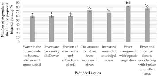 Respondents’ attitude (concerned/ not concerned) towards proposed issues related to the state of rivers and riverine forests. Error bars represent standard error (SE); letters above the bars show if there are statistically significant differences (p < 0.05) in the average number of respondents that find a specific issue concerning (the same letter/letter combination for the type of activity—no statistically significant differences; if letters/letter combinations differ between the types of activities—there are statistically significant differences).
