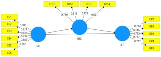 The structural model shows and describes the relationships between latent constructs of the study. The relationship between the latent construct of the structural model is assessed by estimating the model’s explanatory power, the model’s effect size, and the significance of the path coefficient. In this study, the model’s explanatory power was measured by calculating the coefficient of determination or (R2) of the model. The results of the study reveal that the model has sufficient explanatory power and explains about 53.4% variance in the IEP and 39.3% of variance in CS. The effect size was also evaluated by estimating the f2 of the model. According to [84,92], small, medium, and large f2 effect sizes are represented by values greater than 0.02, 0.15, and 0.35. The results show that the effect size of the BTS on CS was large (0.646) and medium on IEP (0.193). The effect size of CS on IEP was also medium (0.235).