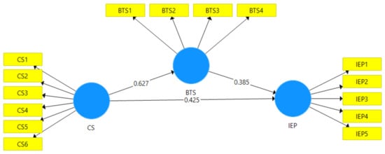 After assessing the model’s explanatory power and effect size, the path coefficient of the model was estimated using the bootstrapping procedure as recommended by Preacher and Hayes (2008) [93]. In this study, the bootstrapping procedure was conducted using 5000 re-samples. The results of the bootstrapping (Figure 3) reveal that the effect of CS and BTS on IEP is positive and significant; hence, H1 and H2 are supported. Statistics in Table 6 also show that there is a positive relationship between CS and IEP through the mediating effect of BTS; hence, H3 is also supported.