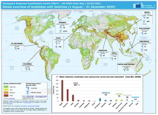 World map representing landslide fatalities from 1 August to 31 December 2020 (European Commission’s Directorate-General for European Civil Protection and Humanitarian Aid Operations, 2022. Available online: https://reliefweb.int/map/world/global-overview-landslides-fatalities-1-august-31-december-2020 (accessed on 10 May 2022).
